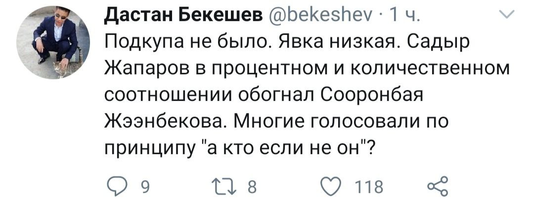 Другая часть, напротив, считает, что выборы прошли честно, без подкупа голосов.Депутат ЖК Дастан Бекешев также написал в Twitter, что подкупа не было.