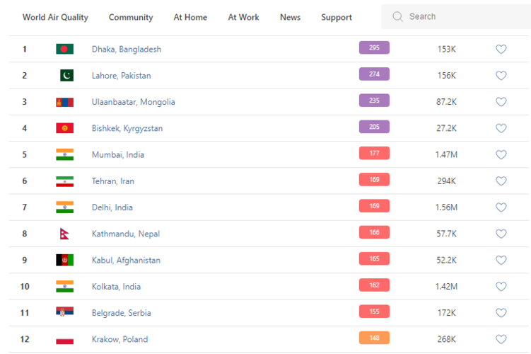 В рейтинге крупнейших городов мира по качеству воздуха World Air Quality Бишкек подялся на четвертое место.
