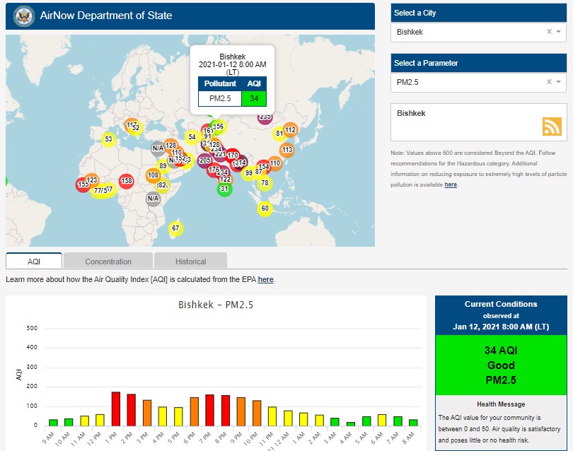 Информация обновляется каждый час. На 8.00 индекс качества воздуха в районе дипломатической миссии — 34 (AQI).