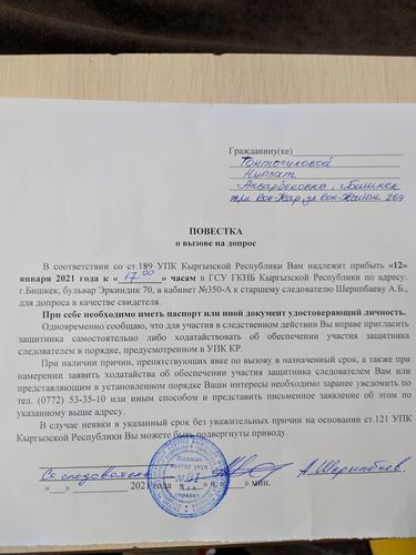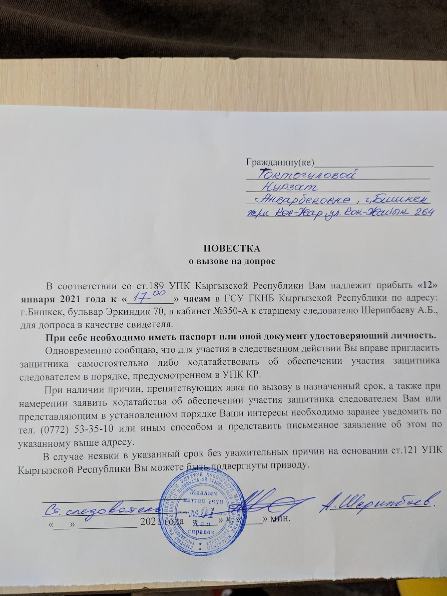 В документе указывается, что Нурзаде Токтогуловой необходимо прибыть на допрос в ГСУ в качестве свидетеля сегодня в 17.00, в противном случае она может быть доставлена в ГКНБ принудительно.