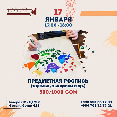 Под руководством мастера Зульфии Акимовой вы научитесь интересной технике росписи на любой поверхности — сумке, деревянной шкатулке, одежде. Материалы входят в стоимость. Регистрация по телефону 0550551293.