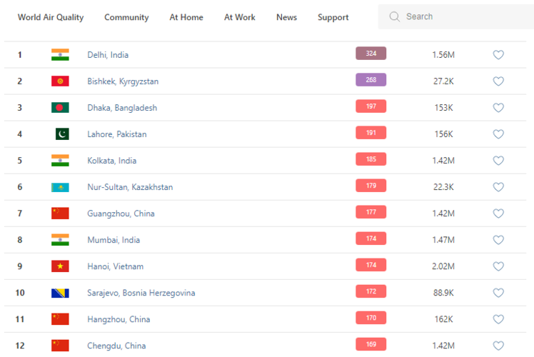 В рейтинге крупнейших городов мира по качеству воздуха World Air Quality Бишкек поднялся на второе место.