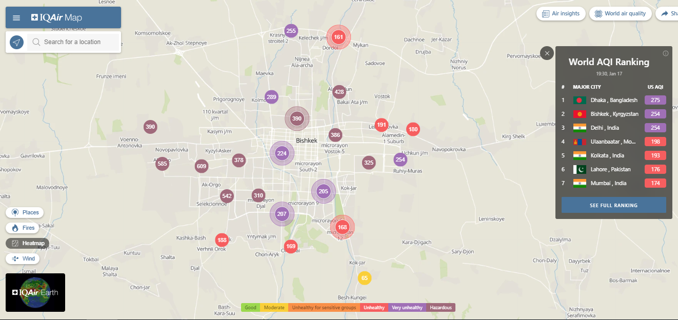 В рейтинге крупнейших городов мира по качеству воздуха World Air Quality Бишкек поднялся на второе место.