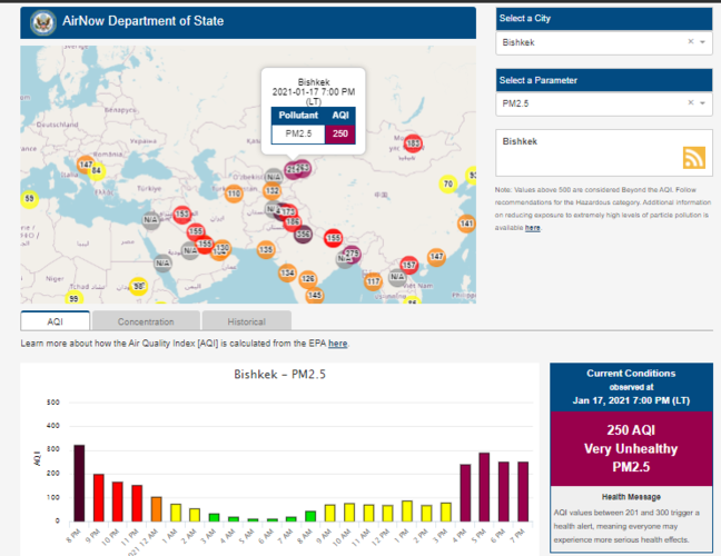 Информация обновляется каждый час. На 19.00 индекс качества воздуха в районе дипломатической миссии — 250 (AQI).