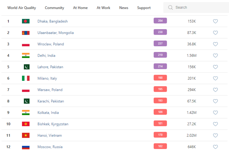 В рейтинге крупнейших городов мира по качеству воздуха World Air Quality Бишкек поднялся на 10-е место.