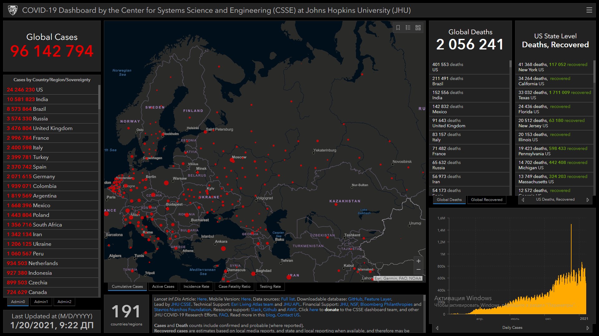 COVID-19 в мире. Заразились более 96,1 миллиона, умерли более 2 миллионов