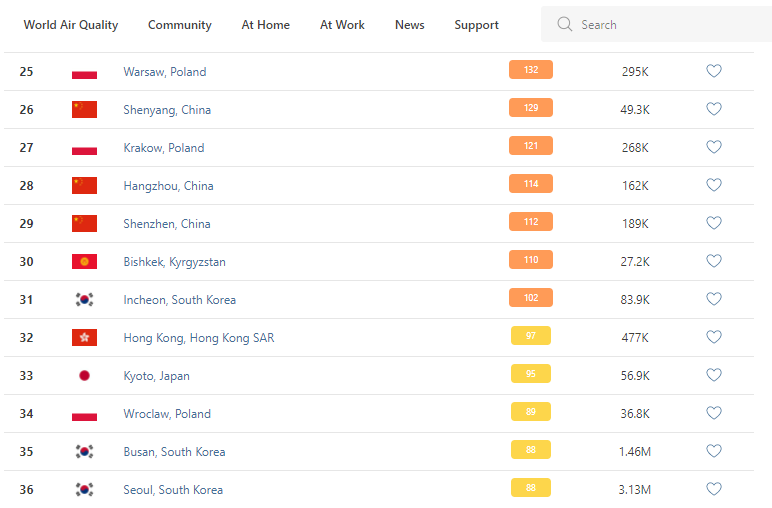 В рейтинге крупнейших городов мира по качеству воздуха World Air Quality Бишкек опустился на 30-е место.