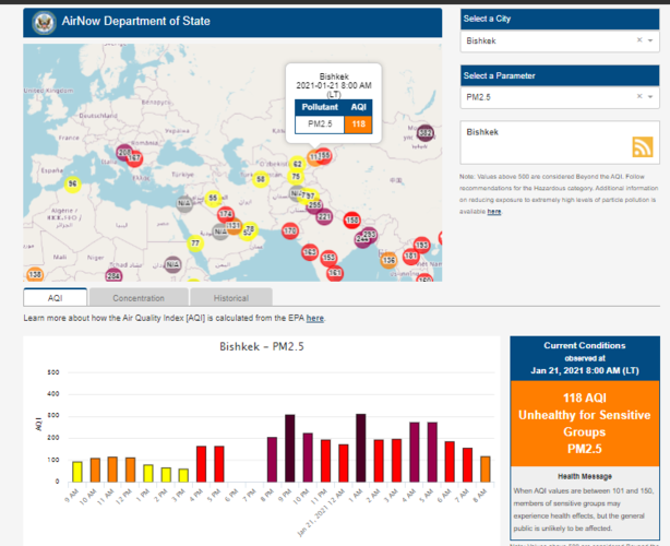 Информация обновляется каждый час. На 8.00 индекс качества воздуха в районе дипломатической миссии — 118 (AQI).