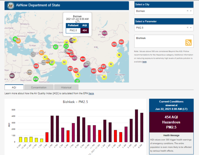 Информация обновляется каждый час. На 8.00 индекс качества воздуха в районе дипломатической миссии — 455 (AQI).