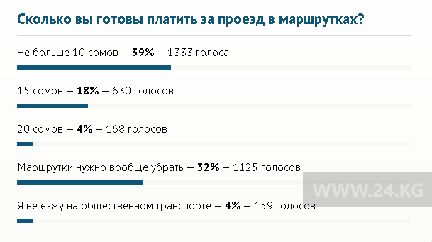 Чуть больше 30 процентов (1 тысяча 125 человек) считают, что маршрутки вообще нужно убрать. При этом 18 процентов проголосовавших готовы платить за проезд 15 сомов и лишь 4 процента — 20 сомов. Столько же респондентов не ездит на общественном транспорте.