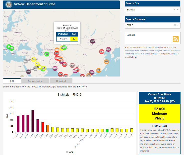 Информация обновляется каждый час. На 9.00 индекс качества воздуха в районе дипломатической миссии — 62 (AQI).