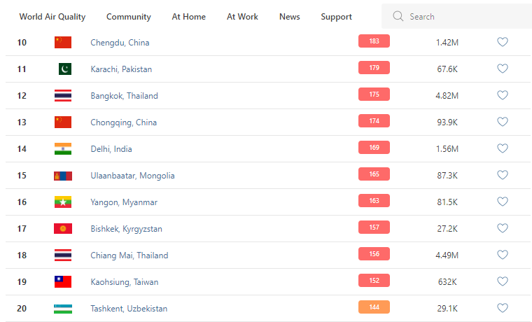 В рейтинге крупнейших городов мира по качеству воздуха World Air Quality Бишкек поднялся на 17-е место.