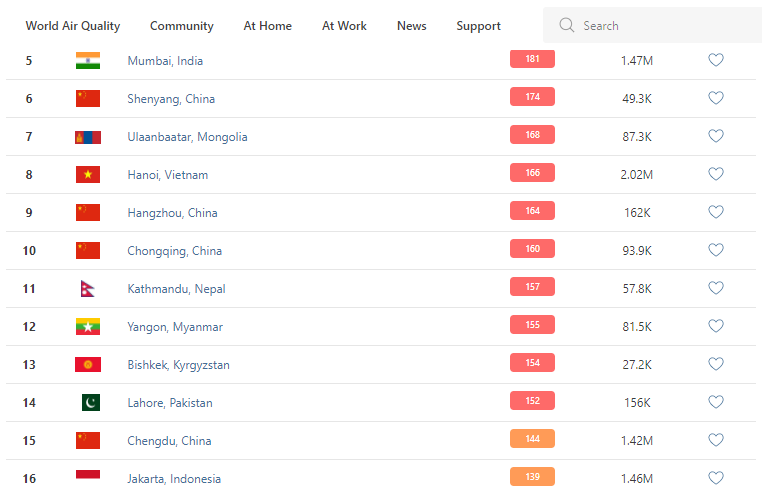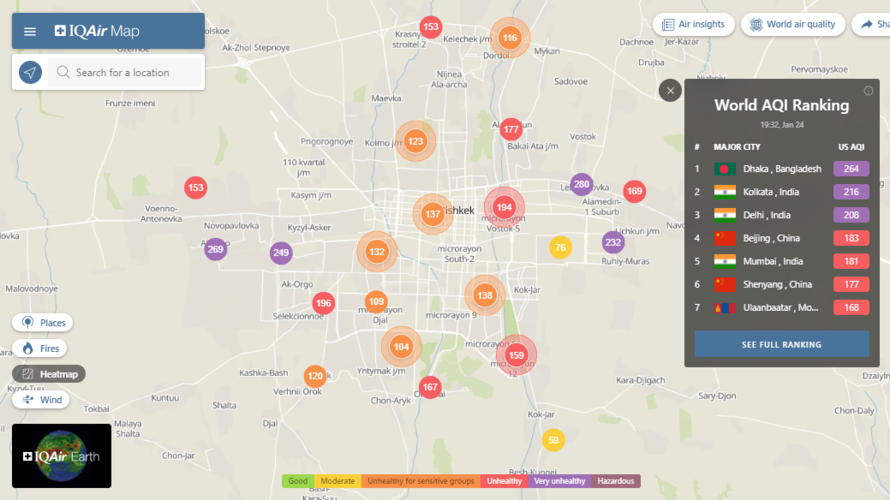 В рейтинге крупнейших городов мира по качеству воздуха World Air Quality Бишкек поднялся на 13-е место.