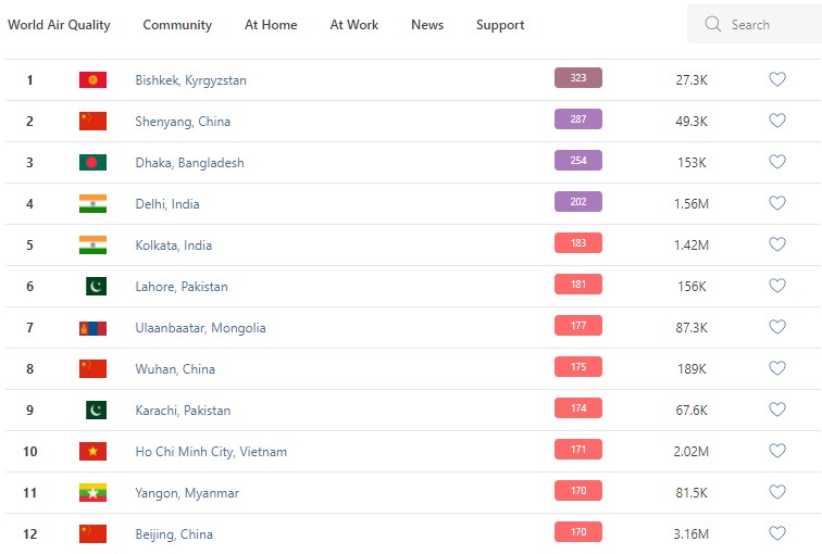 В рейтинге крупнейших городов мира по качеству воздуха World Air Quality Бишкек поднялся на первое место.