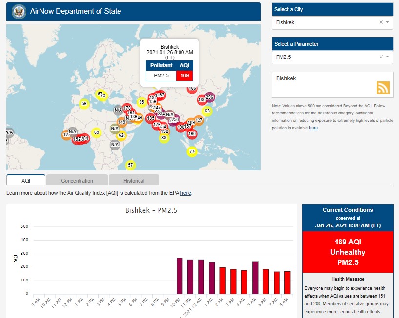 Информация обновляется каждый час. На 8.00 индекс качества воздуха в районе дипломатической миссии — 169 (AQI).