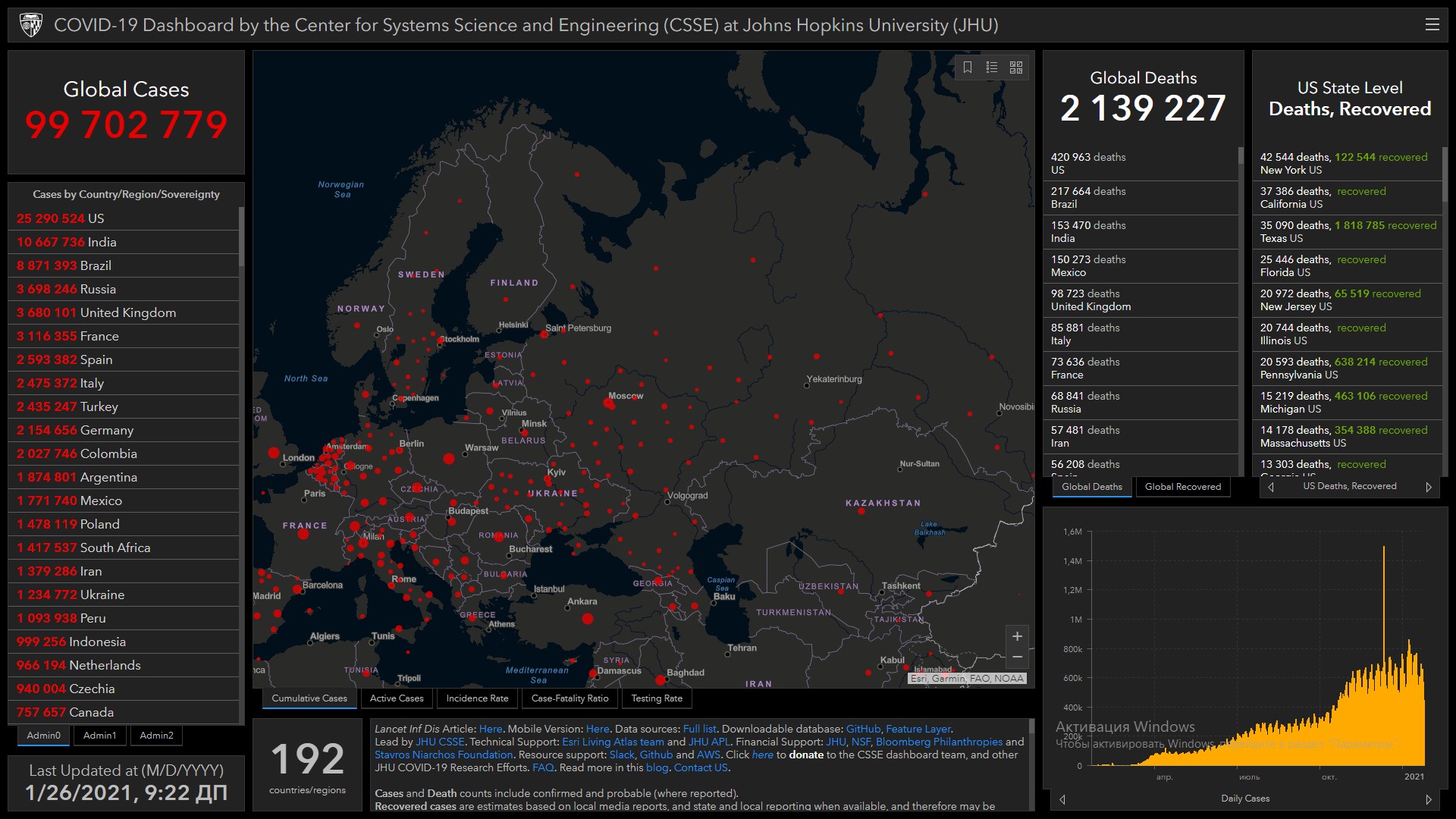 COVID-19 в мире. Заразились более 99,7 миллиона, умерли более 2,1 миллиона