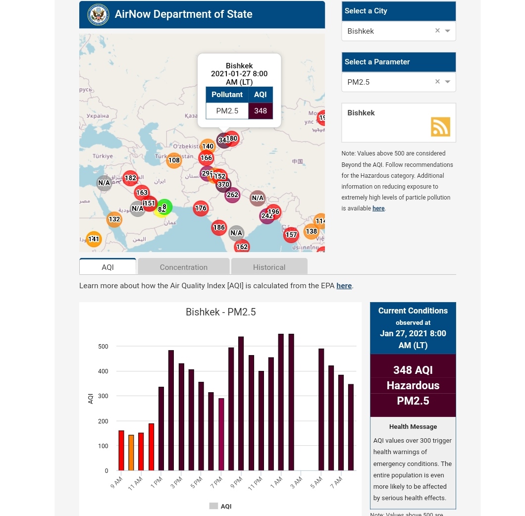 Информация обновляется каждый час. На 8.00 индекс качества воздуха в районе дипломатической миссии — 348 (AQI).