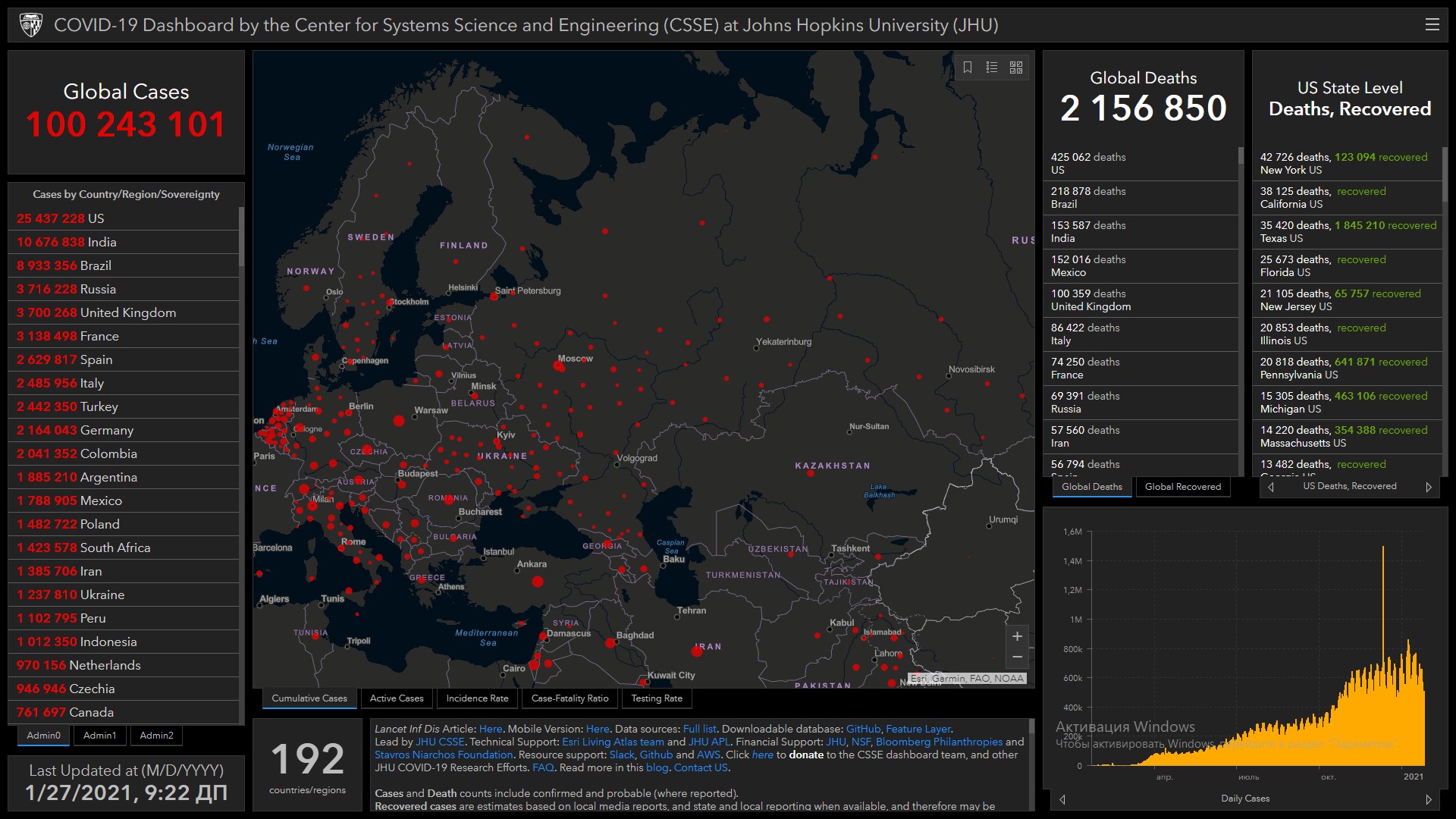 Всего в мире коронавирусом заразились 100 миллионов 243 тысячи 101 человек. Больше всего зараженных в США (25 миллионов 437 тысяч 228), Индии (10 миллионов 676 тысяч 838), Бразилии (8 миллионов 933 тысячи 956), России (3 миллиона 716 тысяч 228), Великобритании (3 миллиона 700 тысяч 268), Франции (3 миллиона 138 тысяч 498), Испании (2 миллиона 629 тысяч 817), Италии (2 миллиона 485 тысяч 956), Турции (2 миллиона 442 тысячи 350), Германии (2 миллиона 164 тысячи 43) и Колумбии (2 миллиона 41 тысяча 352).