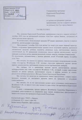 Граждане, пострадавшие во время разгона акции протеста 5 октября 2020 года на центральной площади Ала-Тоо, обратились к генеральному прокурору Курманкулу Зулушеву.