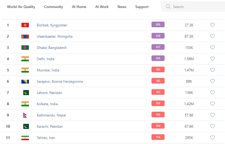 В рейтинге крупнейших городов мира по качеству воздуха World Air Quality Бишкек находится на первом месте.