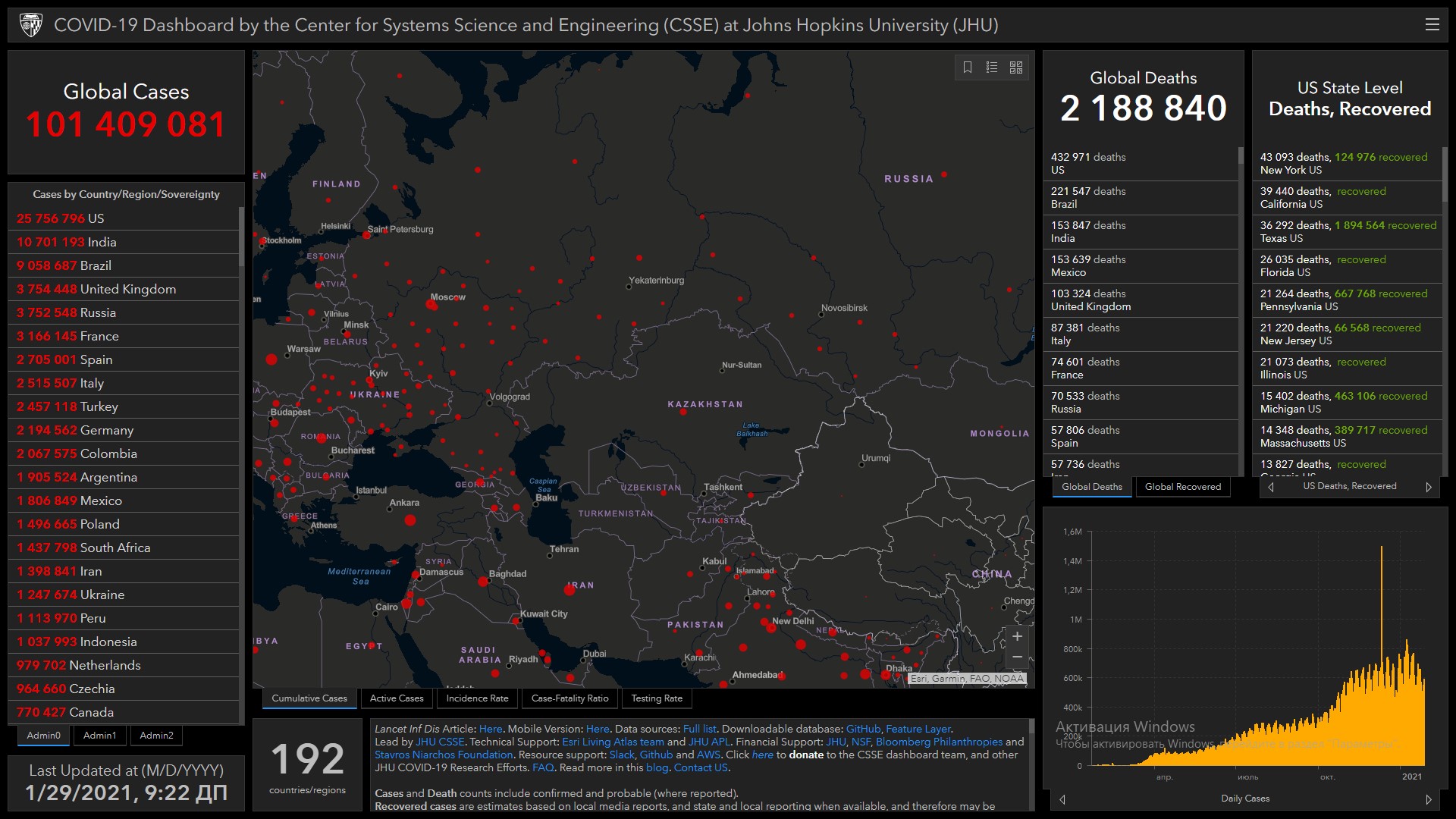 COVID-19 в мире. Заразились более 101,4 миллиона, умерли более 2,1 миллиона