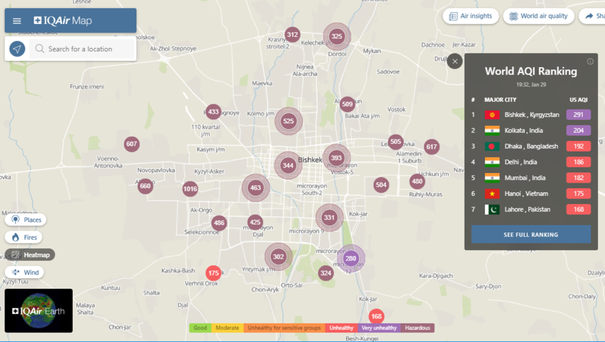 В рейтинге крупнейших городов мира по качеству воздуха World Air Quality Бишкек вновь на первом месте.