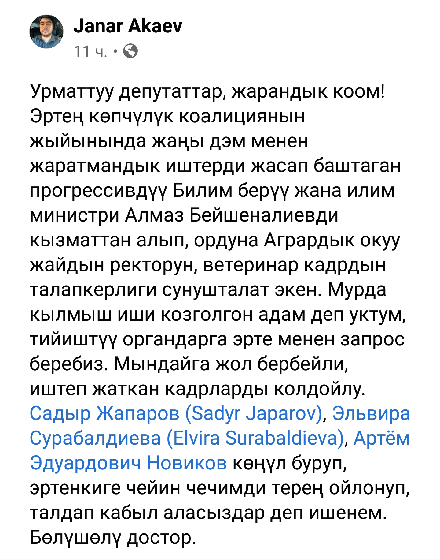 «Завтра на заседании коалиции большинства прогрессивного министра образования и науки Алмаза Бейшеналиева сместят с должности, на его место хотят рекомендовать ректора Кыргызского национального аграрного университета, специализирующегося на ветеринарии. Я слышал, что в отношении него было возбуждено уголовное дело. Утром отправим запрос по этому поводу в соответствующие органы», — написал нардеп.