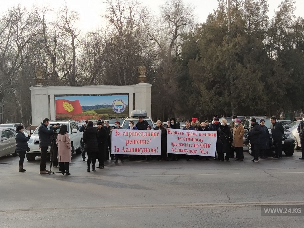 В Бишкеке на митинг к зданию суда вышли сторонники экс-председателя Федерации профсоюзов Кыргызстана Мирбека Асанакунова. На акции собралось около 30 человек.