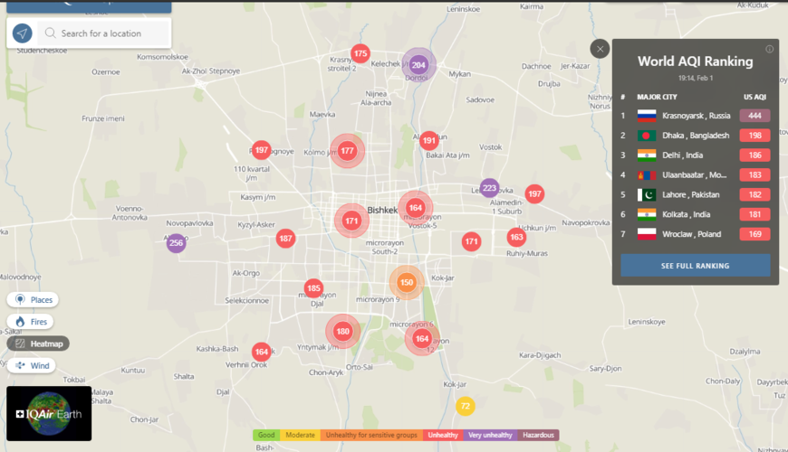 В рейтинге крупнейших городов мира по качеству воздуха World Air Quality Бишкек поднялся на 17-е место.