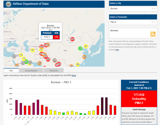 Посольство США в Кыргызстане также установило датчик. Информация обновляется каждый час. На 19.00 индекс качества воздуха в районе дипломатической миссии — 173 (AQI).