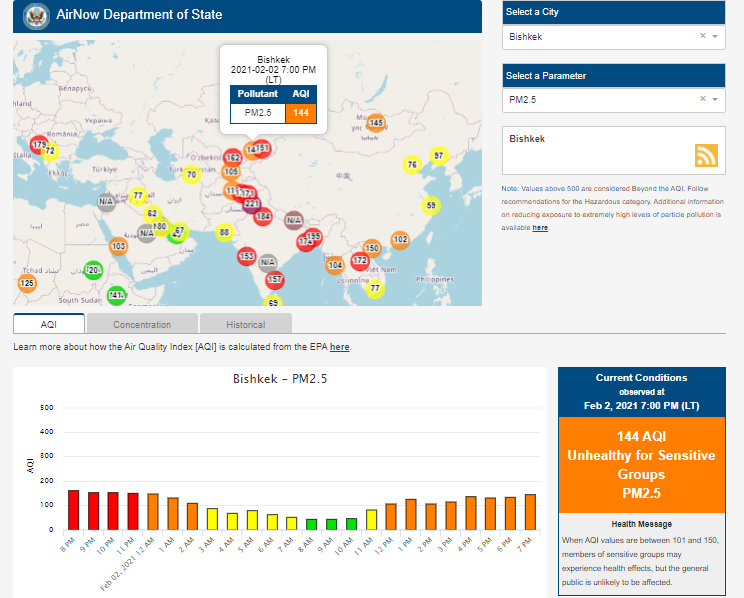 Посольство США в Кыргызстане также установило датчик. Информация обновляется каждый час. На 19.00 индекс качества воздуха в районе дипломатической миссии — 144 (AQI).
