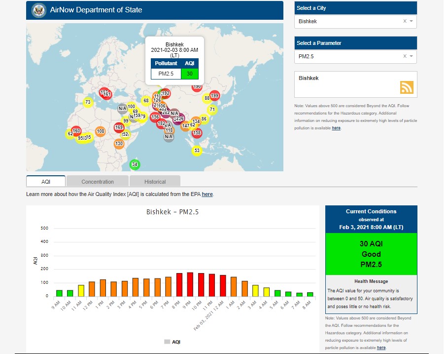 Посольство США в Кыргызстане также установило датчик. Информация обновляется каждый час. На 8.00 индекс качества воздуха в районе дипломатической миссии — 30 (AQI).
