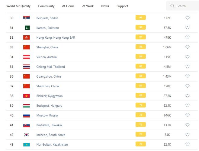 В рейтинге крупнейших городов мира по качеству воздуха World Air Quality Бишкек опустился на 38-е место.