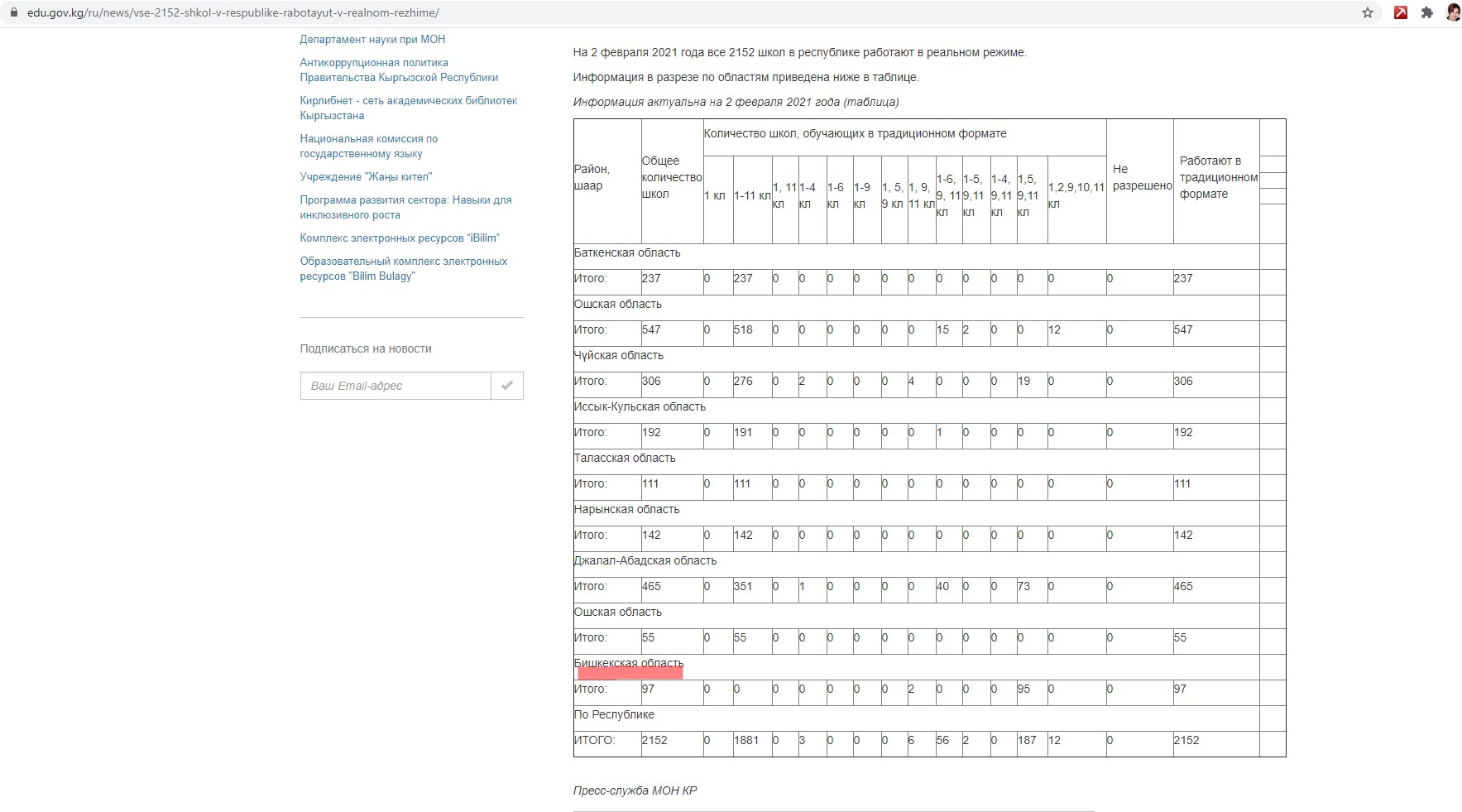 Отмечается, что все 2 тысячи 152 школы в республике работают в реальном режиме. Информация в разрезе по областям приводится в таблице, где и указана Бишкекская область.