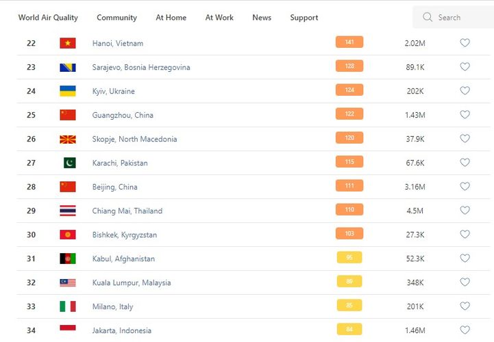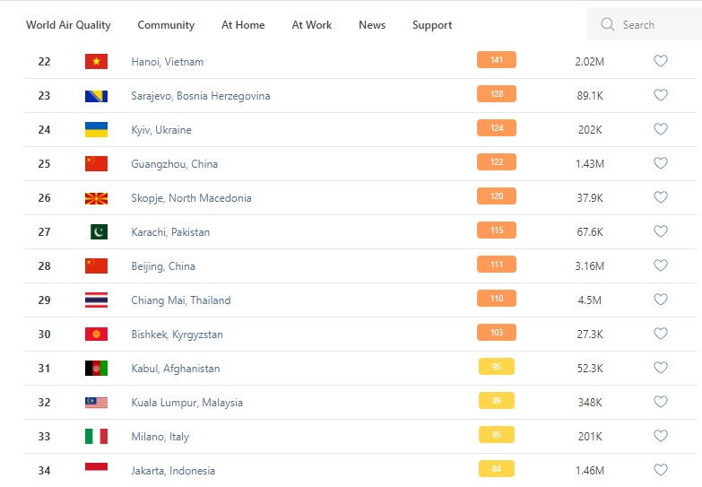 В рейтинге крупнейших городов мира по качеству воздуха World Air Quality Бишкек опустился на 30-е место.