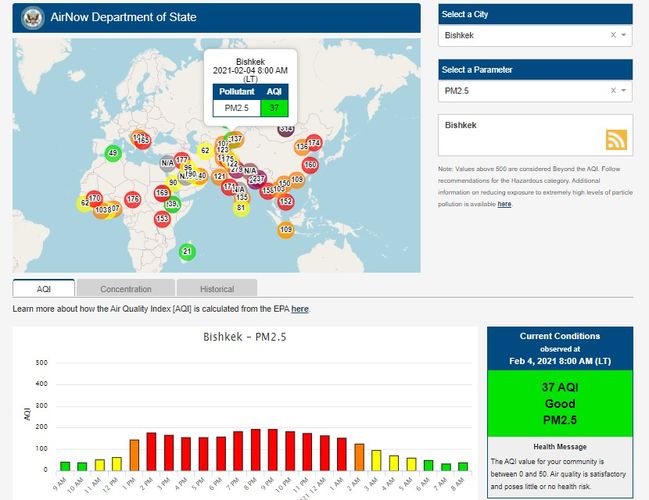 Посольство США в Кыргызстане также установило датчик. Информация обновляется каждый час. На 8.00 индекс качества воздуха в районе дипломатической миссии — 37 (AQI).