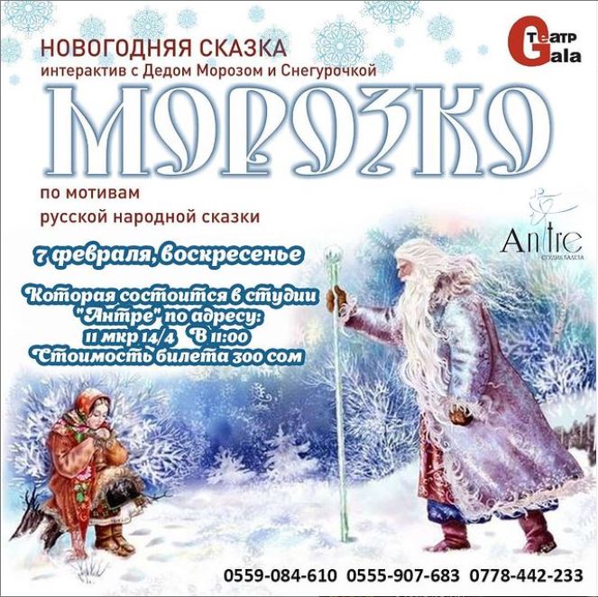 Спектакль, где каждый примет участие и получит море позитивных эмоций. Ведущая сказки — заслуженная артистка КР Галина Кетова. Билеты по телефону 0559084610.