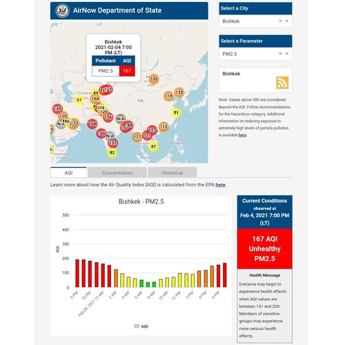 Посольство США в Кыргызстане также установило датчик. Информация обновляется каждый час. На 19.00 индекс качества воздуха в районе дипломатической миссии — 167 (AQI).