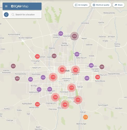 Общественный фонд «Институт экологических решений» установил датчики в столице и пригороде. На карте можно увидеть среднее значение AQI в разных районах Бишкека. Его обновляют ежечасно.