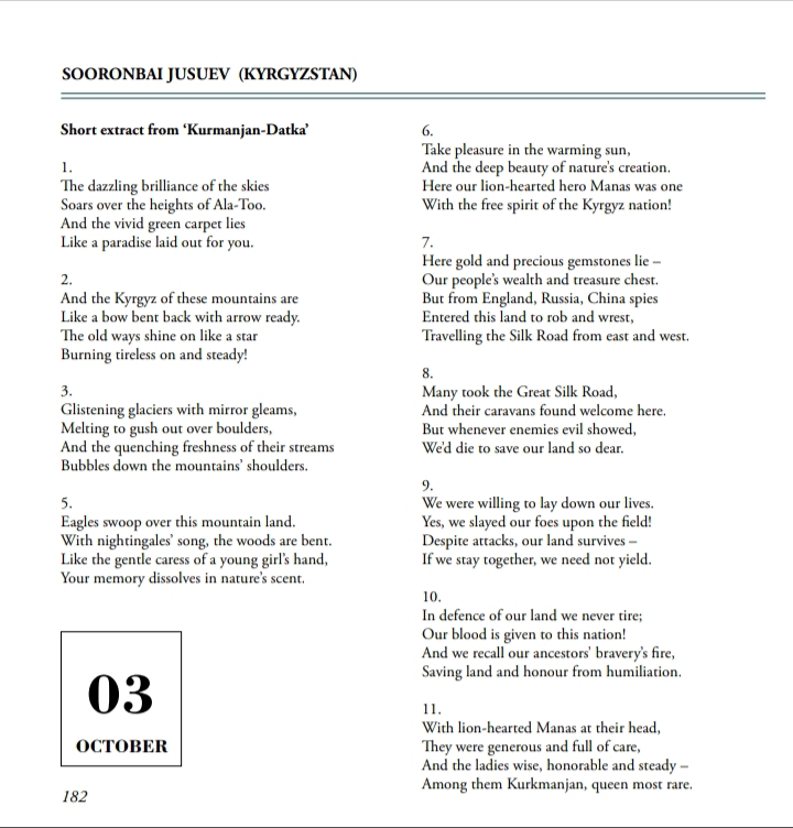 В проекте участвовали 39 современных поэтов из 13 разных стран Евразийского региона, среди которых один из наиболее известных — кыргызский поэт Сооронбай Жусуев.