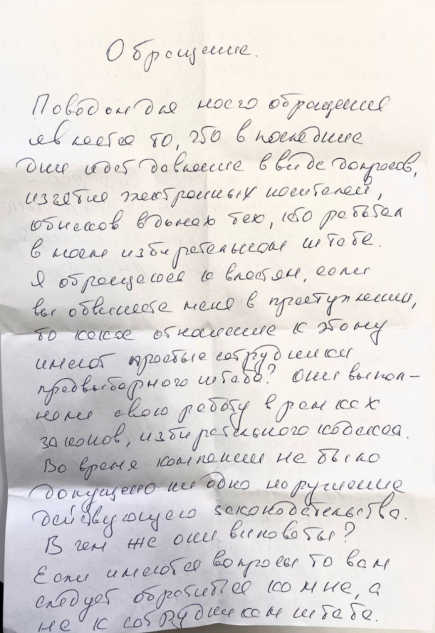 «Я обращаюсь к властям: если вы обвиняете меня в преступлении, то какое отношение к этому имеют простые сотрудники предвыборного штаба? Они выполняли свою работу в рамках законов, избирательного кодекса. Во время кампании не было допущено ни одного нарушения действующего законодательства. В чем же они виноваты? Если имеются вопросы, то вам следует обратиться ко мне, а не к сотрудникам штаба. Какие-либо обвинения рядовых сотрудников штаба не имеют под собой почвы. Они ни в чем не виноваты. Все данные действия рассматриваю как продолжение политического преследования за высказанную критику в адрес властей», — говорится в сообщении.