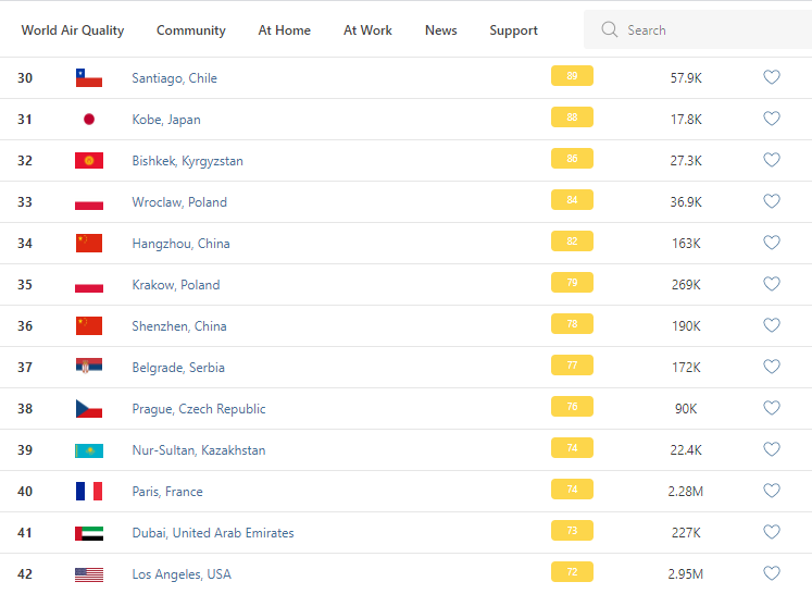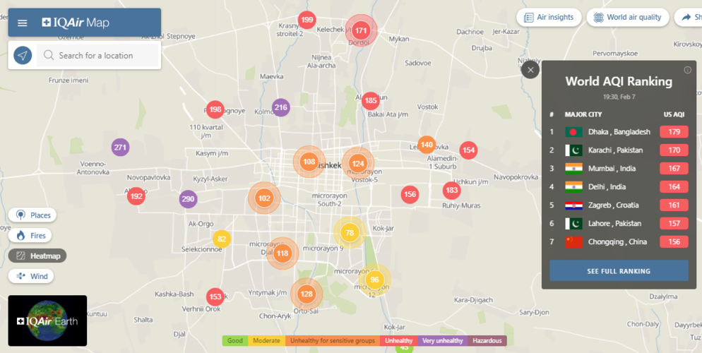 В рейтинге крупнейших городов мира по качеству воздуха World Air Quality Бишкек поднялся на 32-е место.