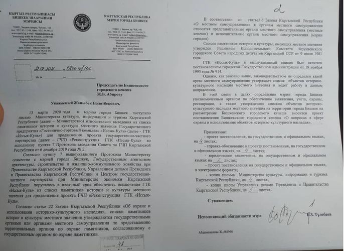 В нем отмечено, что в столичный муниципалитет поступило письмо из Министерства культуры, информации и туризма от 13 марта 2020 года относительно выведения гостиницы из списка памятников для продвижения проекта государственно-частного партнерства «Реконструкция гостинично-торгового комплекса «Иссык-Куль».