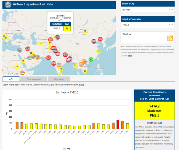 Посольство США в Кыргызстане также установило датчик. Информация обновляется каждый час. На 19.00 индекс качества воздуха в районе дипломатической миссии — 94 (AQI).