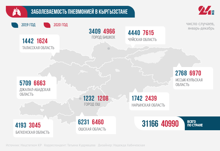 Если в 2019 году на 100 тысяч населения насчитывалось 10 умерших от пневмонии, то в 2020-м — 21. Наибольшее превышение среднереспубликанского показателя смертности от пневмонии отмечалось в Чуйской и Нарынской областях.