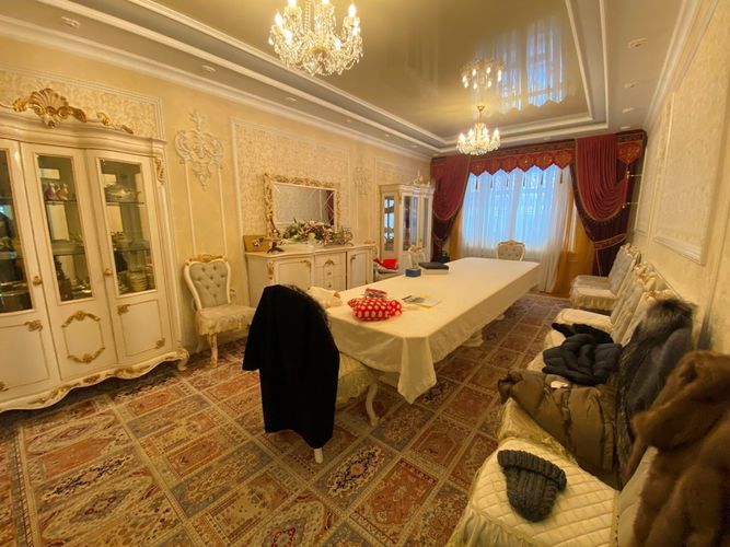 Интерьер приемной-столовой комнаты в доме директора департамента дорожного хозяйства при Минтрансе Шабданбека Иманкулова изобилует лепниной, она имеет место быть. Мебель неплохая, портьеры алого цвета в этническом стиле — не лучшая компания барочному стилю интерьера и очень спорны в контексте конкретной комнаты.
