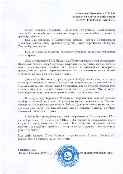 «Доводим до вас о некоторых нарушениях муфтием страны и считаем их неприемлемыми. А именно в открытом доступе в социальных сетях есть выступление самого Максата ажы Токтомушева, где он открыто проповедует и пропагандирует течение салафитов и Таблиги Джамаата. Что в корне противоречит нашим устоям и традиционному вероисповеданию», — говорится в письме.