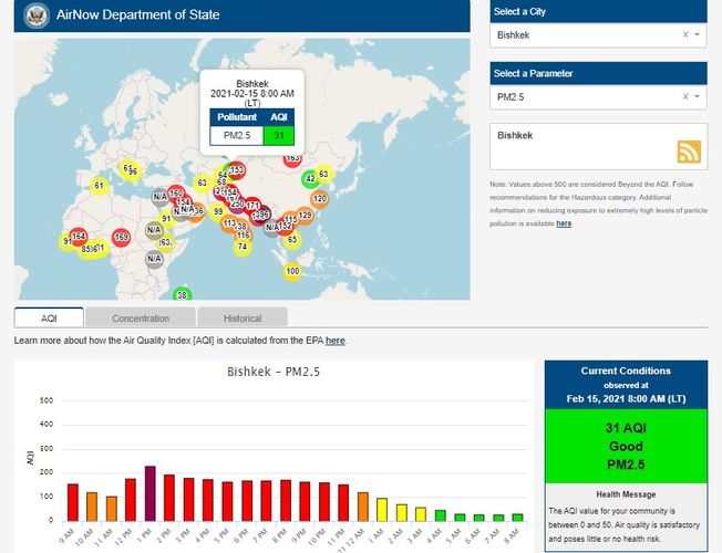 Посольство США в Кыргызстане также установило датчик. Информация обновляется каждый час. На 8.00 индекс качества воздуха в районе дипломатической миссии — 31 (AQI).