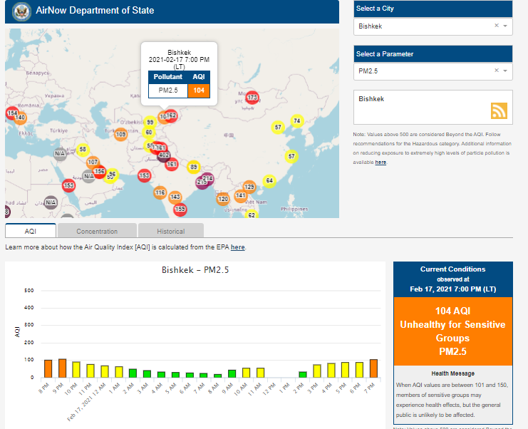 Посольство США в Кыргызстане также установило датчик. Информация обновляется каждый час. На 19.00 индекс качества воздуха в районе дипломатической миссии — 104 (AQI).