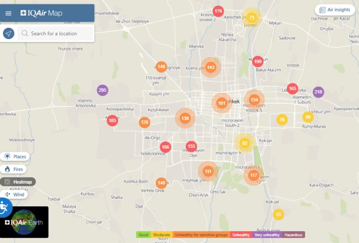 Общественный фонд «Институт экологических решений» установил датчики в столице и пригороде. На карте можно увидеть среднее значение AQI в разных районах Бишкека. Его обновляют ежечасно.